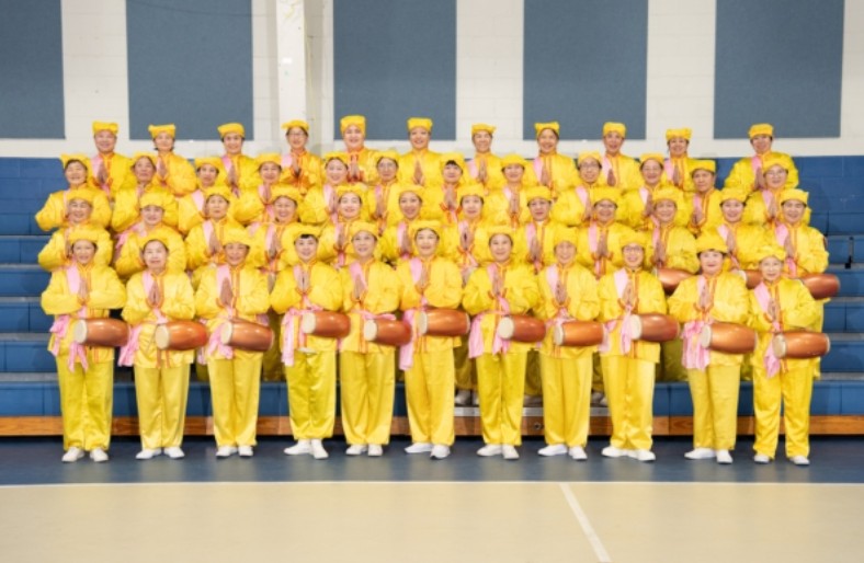 2026年2月14日,纽约腰鼓队的部分队员在中国新年到来之际,双手合十,恭祝师父李洪志先生过年好。(大纪元)